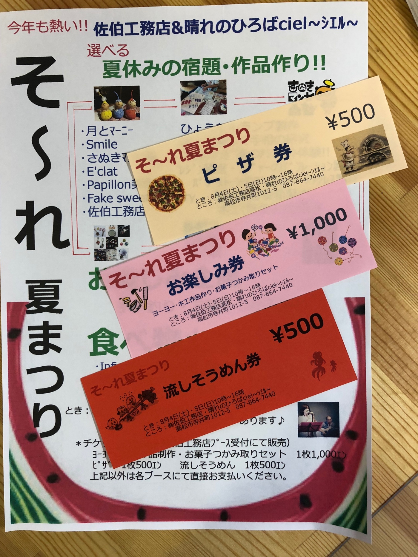 ピザ1枚 500エン 流しそうめん1枚 500エン